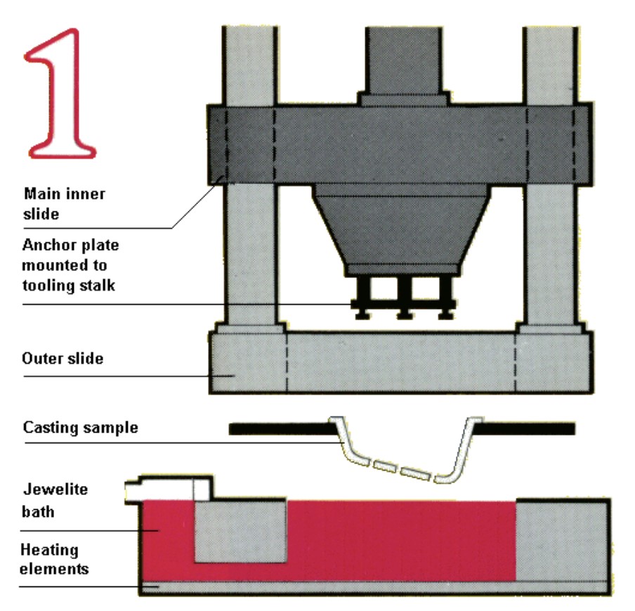 The tools are cast using a unique, low melting point, alloy called ‘Jewelite’, housed in a special bath situated within the press toolspace. After use, the tools are melted down again in situ and new tools cast. The process can be completed in approximately 3 hours on the smallest presses and under 24 hours on the larger Dualform models. The operation can easily be repeated for each new (or repeat) batch of pressed components.