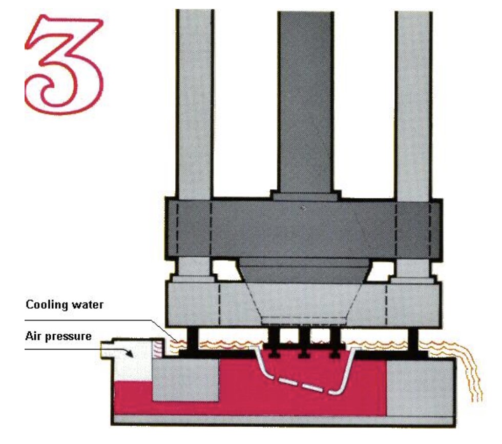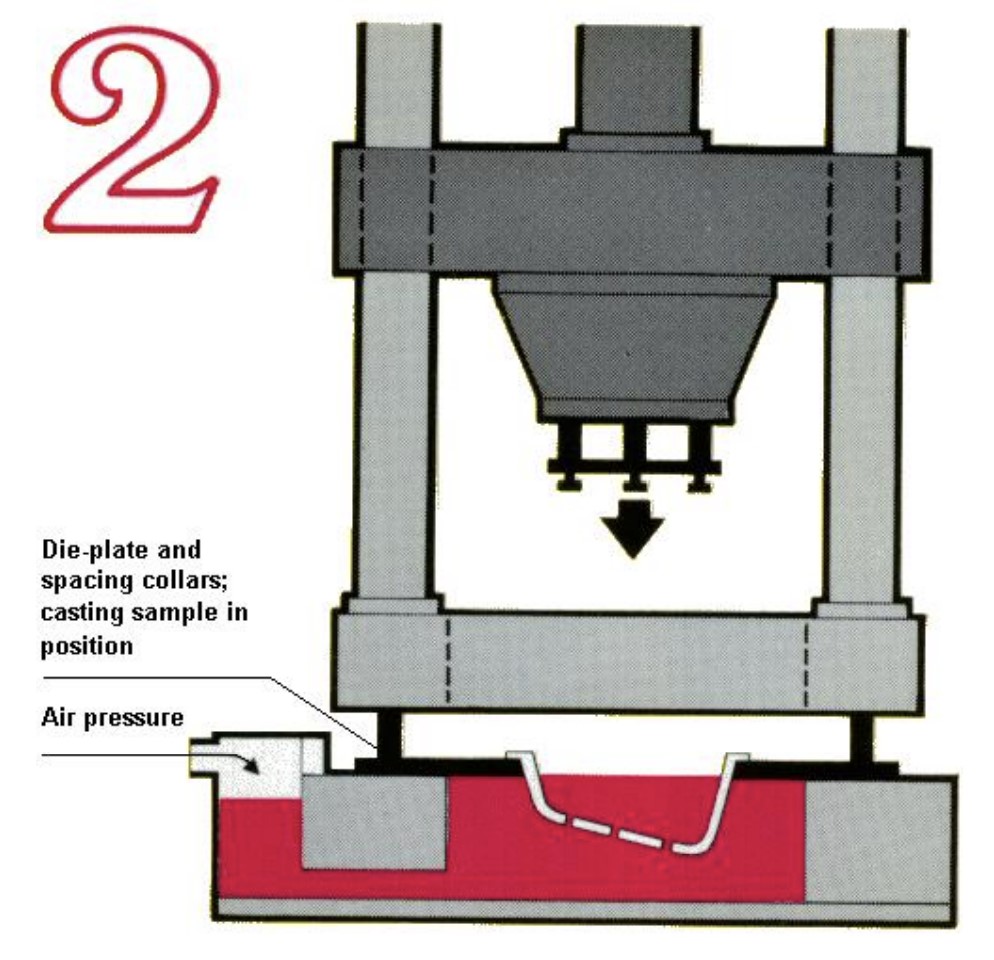 1. When solid, the main inner slide is raised, taking with it the alloy which filled the sample. This alloy becomes the top die.
