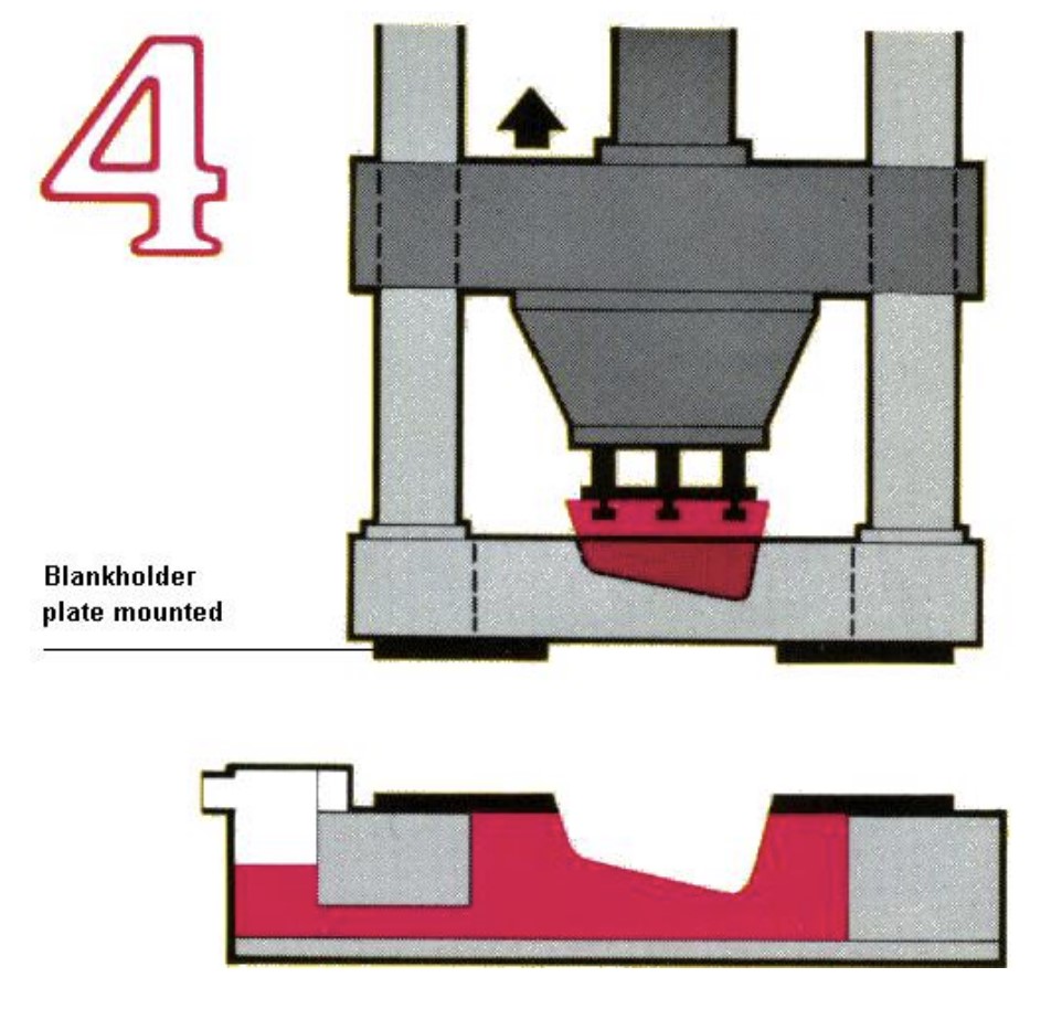 4.  Presswork begins as with normal double action press tools. On completion of the run of pressings the plates are removed, the punch lowered into the die and the tools melted down ready for the subsequent component.